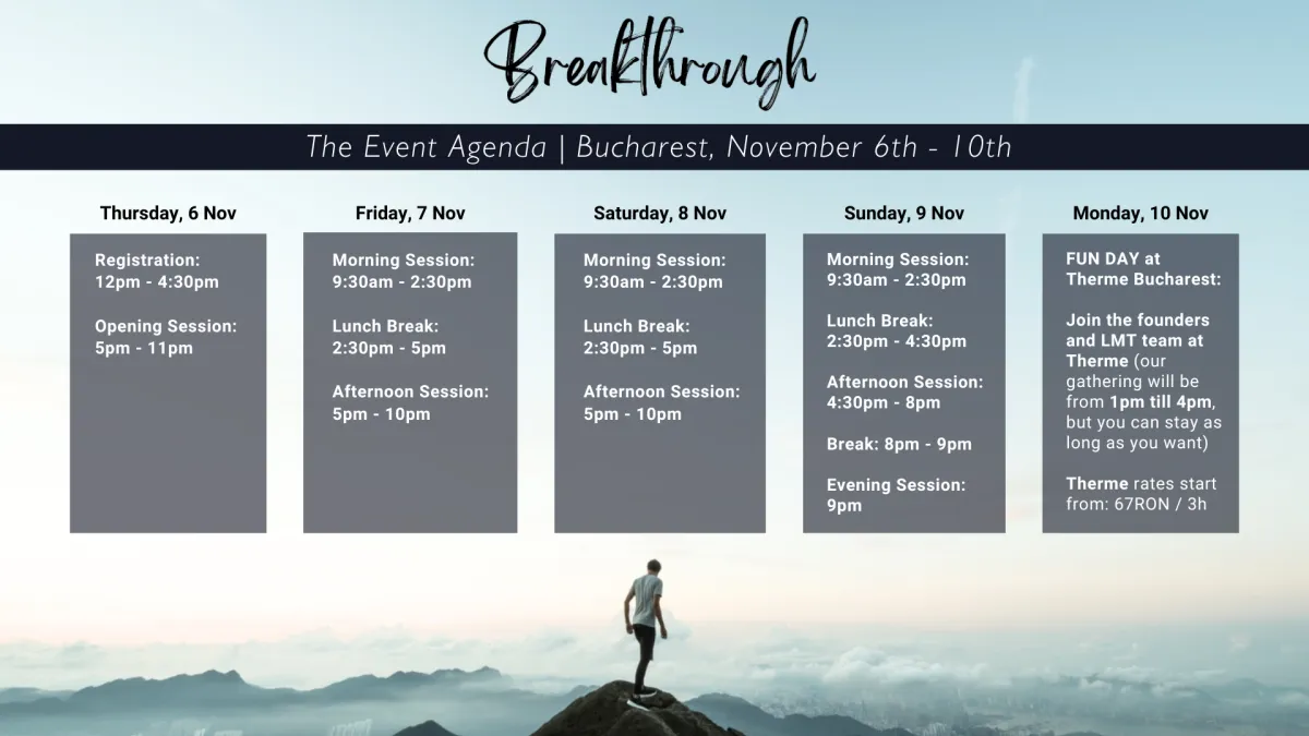 În cadrul acestui eveniment de 5 zile, trainerul tău, Marc Accetta, te va ghida printr-o serie de exerciții care îți vor permite să examinezi aspecte esențiale ale vieții tale, pentru ca apoi să poți face ajustările necesare și să ai parte de o transformare reală în rezultatele pe care le experimentezi.